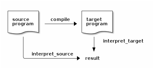 Mimer (repressing a smile): Another such commuting diagram relates the interpreter for a source language, a compiler from this source language to a target language, and the interpreter for this target language: