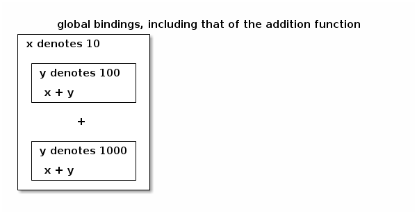 Concretely, in the standard global environment (where the addition function is denoted by a name, and this name is implicitly referred to by the infix notation +):